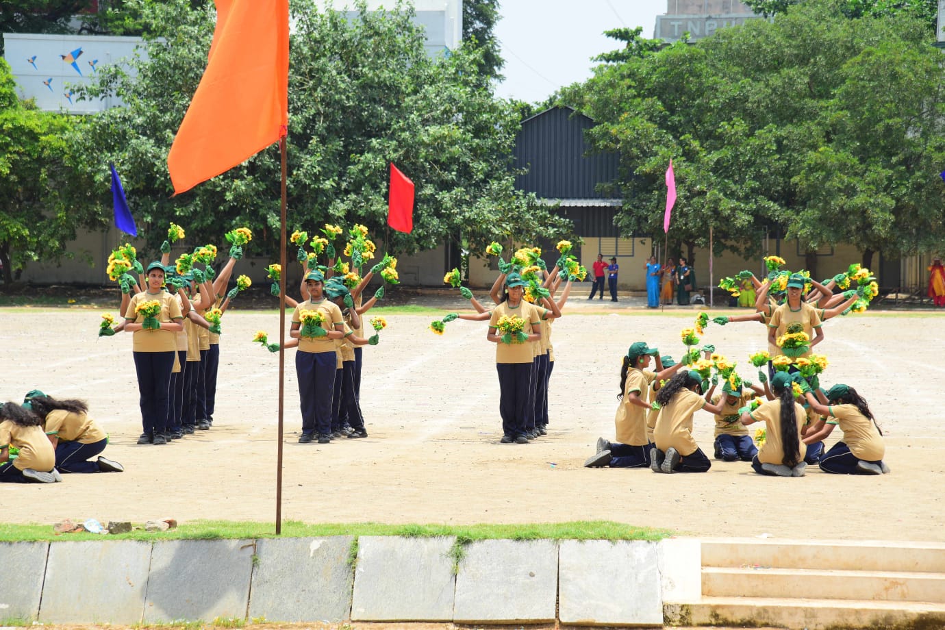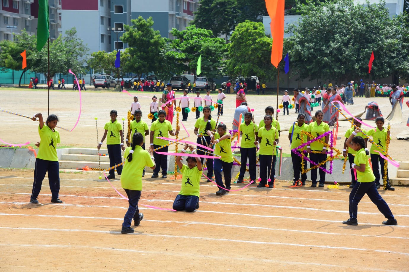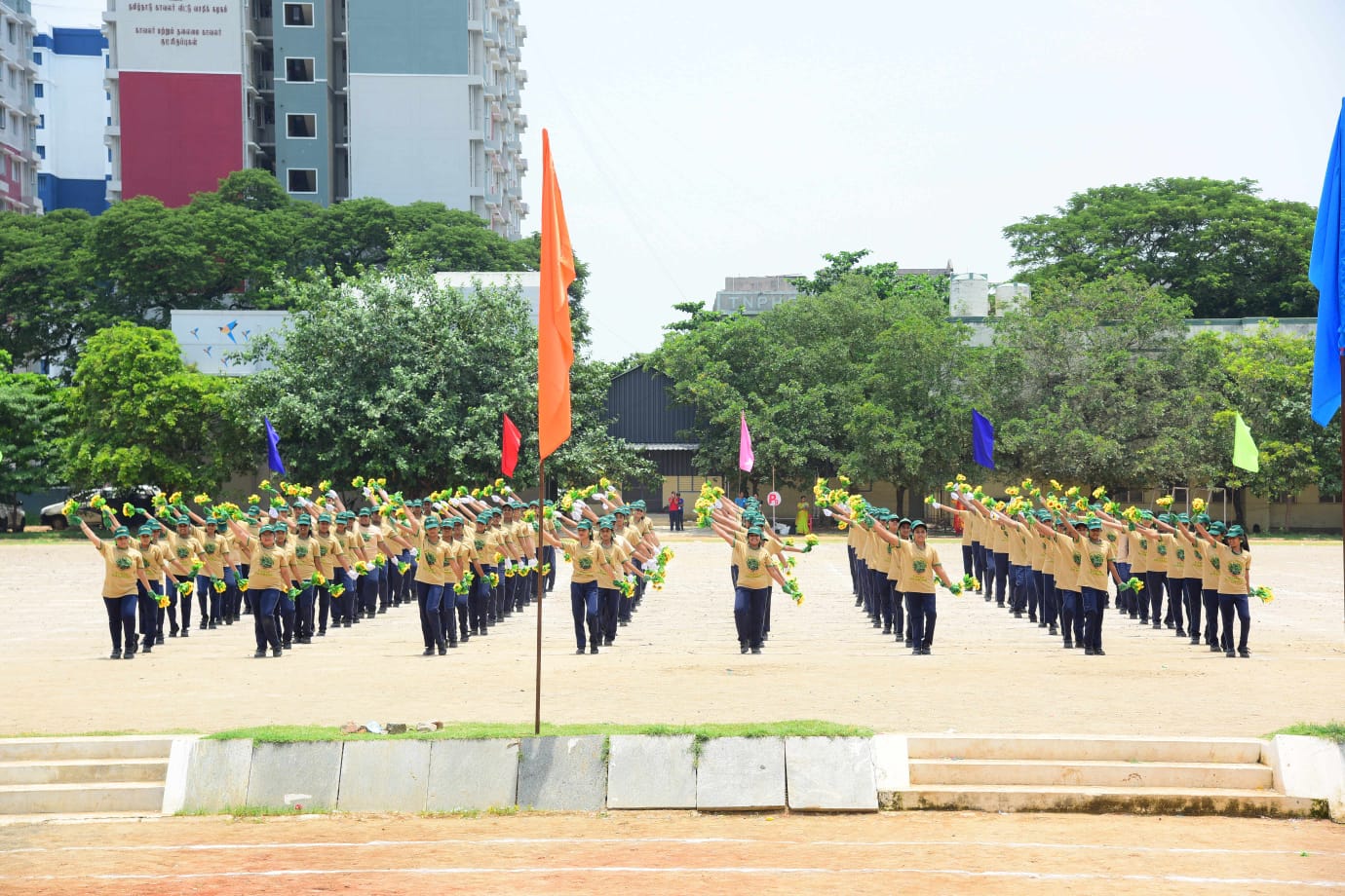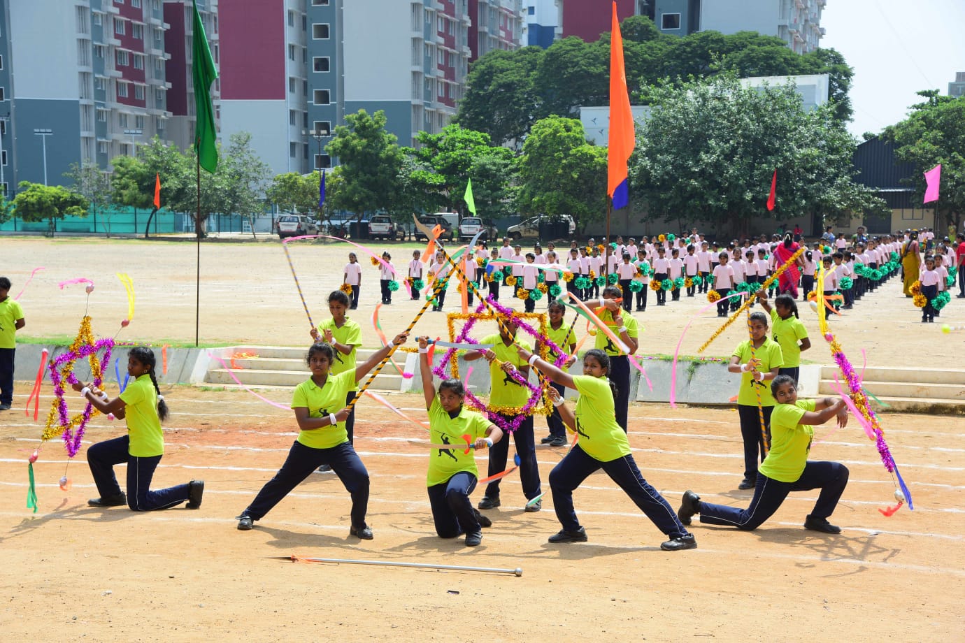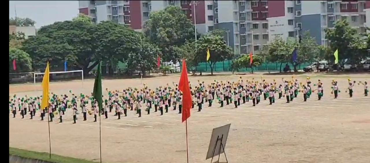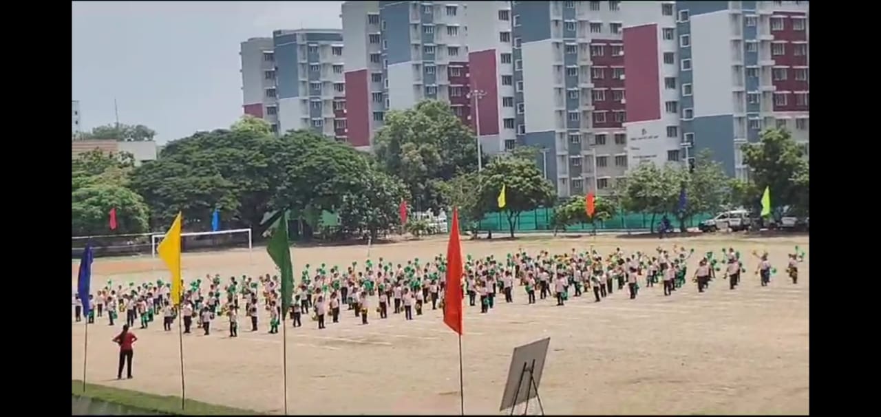 The Honourable Minister Sekar Babu addressed the gathering with a motivational speech. To exhibit the importance of team work and coordination, students participated in several drills. The tiny tots of KG performed unicorn drill, std I and II did a drill with pom–pom as props, followed by std III & IV with their dumbbell drill, and the FLAG drill of class V & VI kindled the sense of unity in diversity and Go Green by VII and VIII, “Save trees” by high school. The bold and stunning performance of the school band, Silambam and Yoga, kept the audience spellbound. All displays offered entertainment of a most novel and pleasing nature.