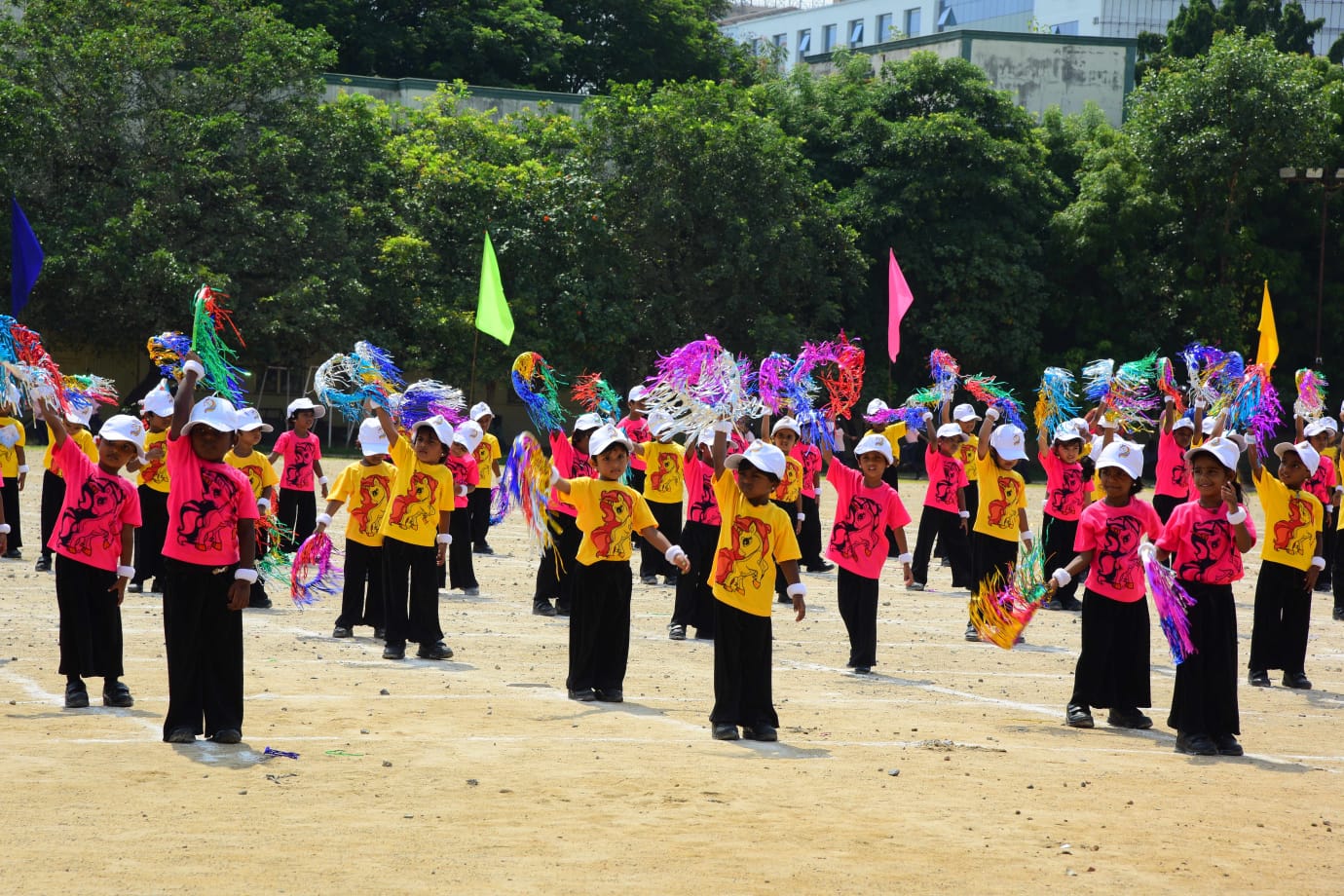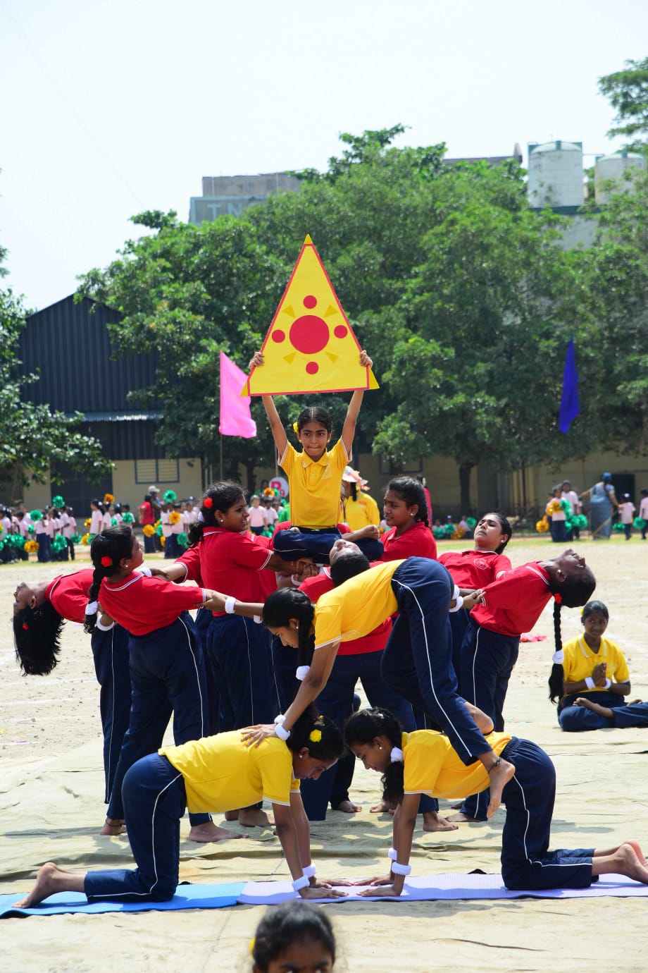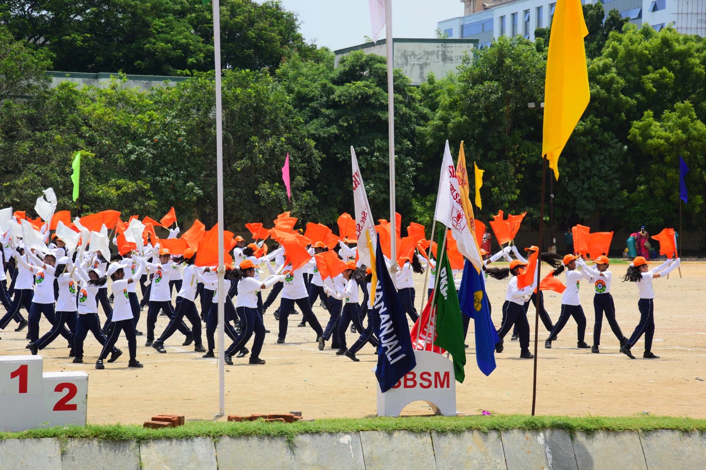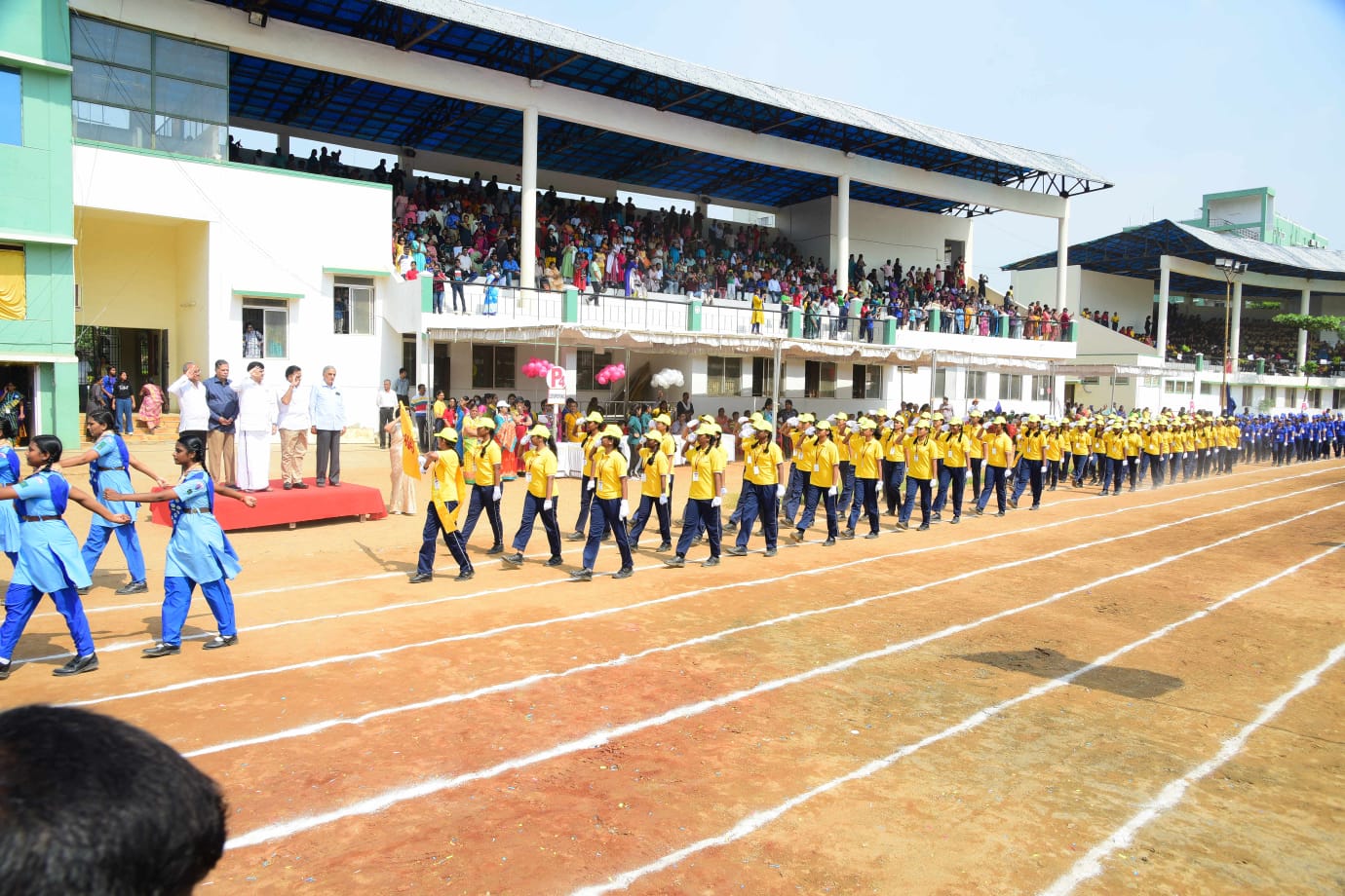 The Honourable Minister Sekar Babu addressed the gathering with a motivational speech. To exhibit the importance of team work and coordination, students participated in several drills. The tiny tots of KG performed unicorn drill, std I and II did a drill with pom–pom as props, followed by std III & IV with their dumbbell drill, and the FLAG drill of class V & VI kindled the sense of unity in diversity and Go Green by VII and VIII, “Save trees” by high school. The bold and stunning performance of the school band, Silambam and Yoga, kept the audience spellbound. All displays offered entertainment of a most novel and pleasing nature.