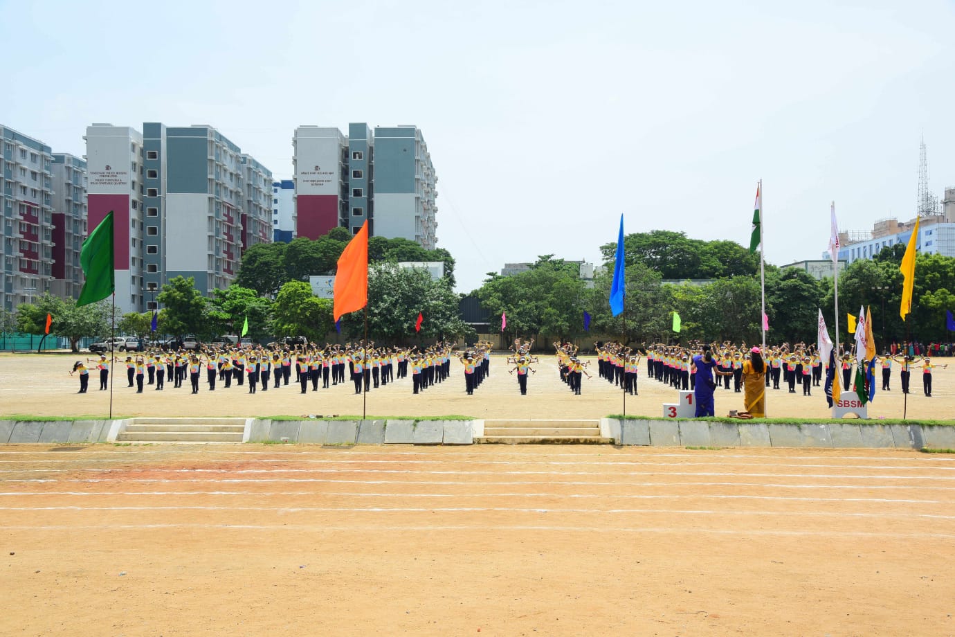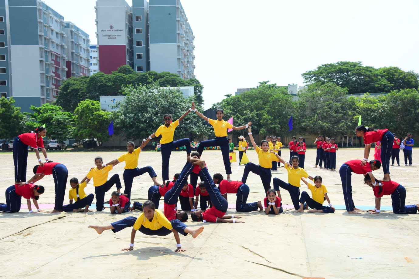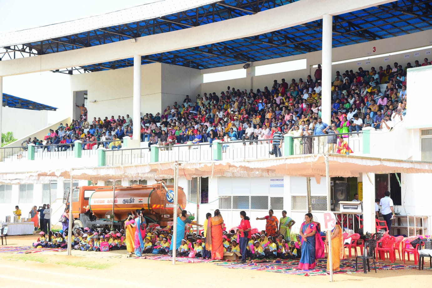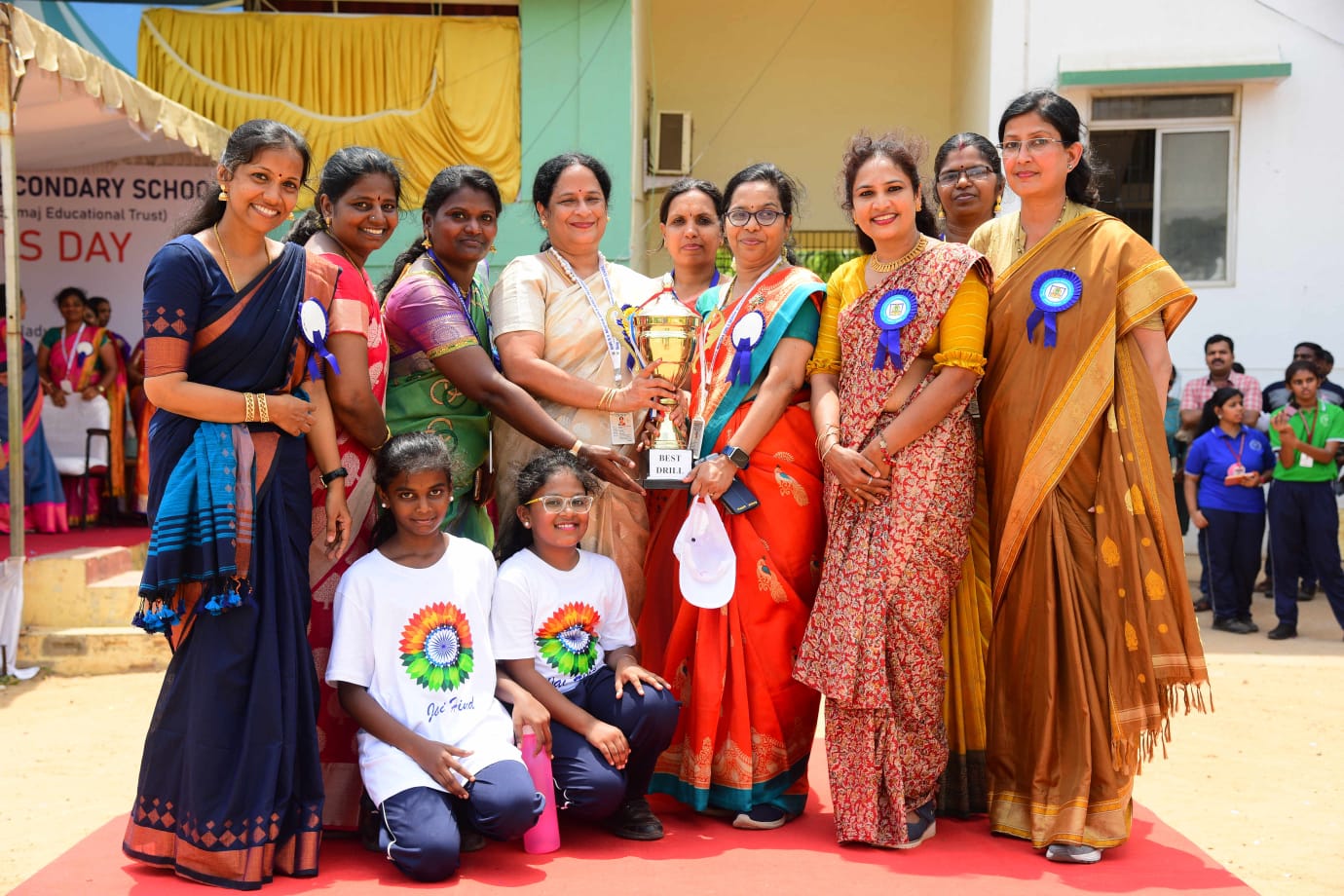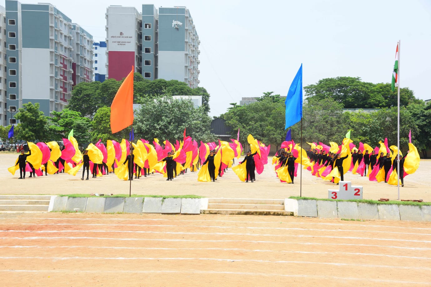 The Honourable Minister Sekar Babu addressed the gathering with a motivational speech. To exhibit the importance of team work and coordination, students participated in several drills. The tiny tots of KG performed unicorn drill, std I and II did a drill with pom–pom as props, followed by std III & IV with their dumbbell drill, and the FLAG drill of class V & VI kindled the sense of unity in diversity and Go Green by VII and VIII, “Save trees” by high school. The bold and stunning performance of the school band, Silambam and Yoga, kept the audience spellbound. All displays offered entertainment of a most novel and pleasing nature.