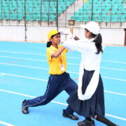 In his address, the Chief Guest emphasized the importance of sports as a foundation for building strong character and instilling valuable life lessons. A series of breathtaking performances followed, blending athletic excellence with cultural pride. The KG students opened the show with a colourful tribal drill that brought smiles to every face. This was followed by a coordinated dumbbell drill and pyramid formation by Classes I and II. Classes III and IV impressed with their vibrant act “Operation Sindoor”, which honoured India’s brave warriors and celebrated patriotism. Students of Classes V and VI presented a graceful hand-themed drill, conveying health and fitness messages with eye-catching placards. Senior students took the stage with a powerful rhythmic yoga display, forming divine patterns symbolizing Goddess Saraswati, Lakshmi, and Durga. Martial arts forms like Silambam and Karate, along with Archery demonstrations, showcased students’ refined talent, control, and relentless discipline. These presentations reflected not just fitness and flair, but also creativity and purpose.