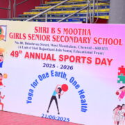Shri B. S. Mootha Girls’ Senior Secondary School celebrated its 49ᵗʰ Annual Sports Day with tremendous energy and grandeur on 21ˢᵗ June 2025 at Nehru Stadium, Chennai. The day carried double significance as it coincided with International Yoga Day, celebrated under the theme “Yoga for One Earth, One Health.” The stadium came alive with colour, movement, and emotion as students, teachers, parents, and dignitaries gathered to witness a spectacular display of sportsmanship, fitness, and unity.