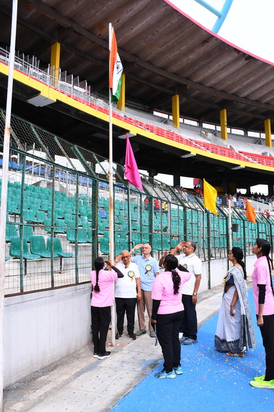 The day’s events began with a solemn prayer, invoking blessings for a successful event. This was followed by the hoisting of the National Flag and School Flag, as the crowd stood united in respect. The torch relay and March Past were a visual delight, as the four houses — Deepanjali, Gyananjali, Premanjali, and Pushpanjali — marched in perfect synchrony, proudly showcasing their strength, unity, and vibrant house spirit. The ceremonial lighting of the torch by the Chief Guest marked the official opening of the Sports Day. Followed by the oath-taking ceremony which reflected the students’ commitment to compete with integrity and uphold the values of sportsmanship.