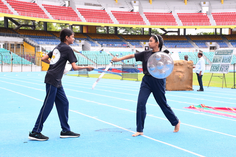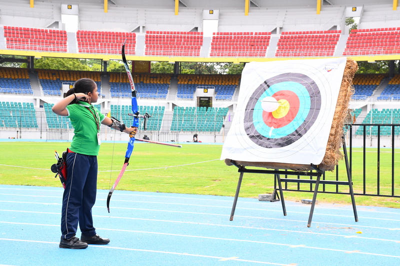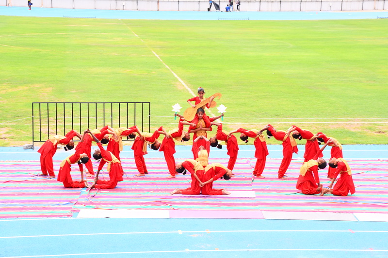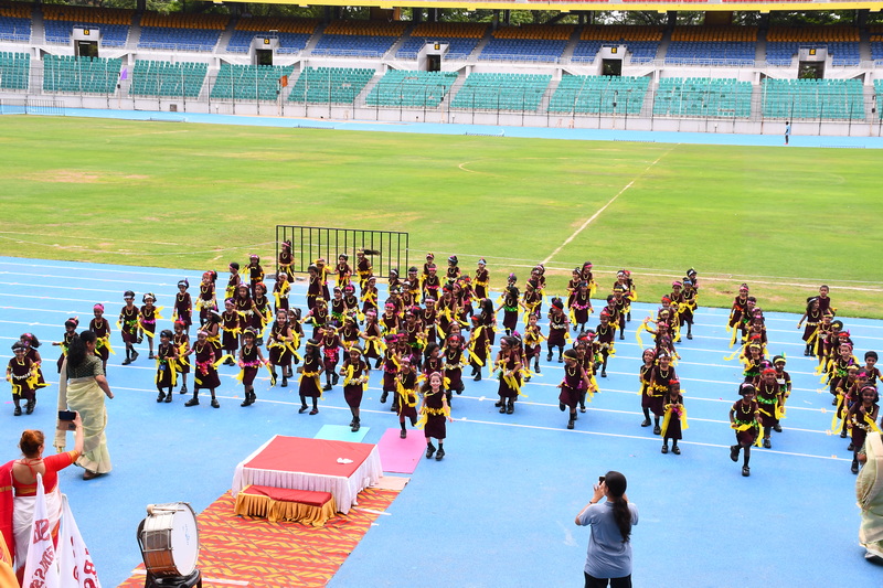 In his address, the Chief Guest emphasized the importance of sports as a foundation for building strong character and instilling valuable life lessons. A series of breathtaking performances followed, blending athletic excellence with cultural pride. The KG students opened the show with a colourful tribal drill that brought smiles to every face. This was followed by a coordinated dumbbell drill and pyramid formation by Classes I and II. Classes III and IV impressed with their vibrant act “Operation Sindoor”, which honoured India’s brave warriors and celebrated patriotism. Students of Classes V and VI presented a graceful hand-themed drill, conveying health and fitness messages with eye-catching placards. Senior students took the stage with a powerful rhythmic yoga display, forming divine patterns symbolizing Goddess Saraswati, Lakshmi, and Durga. Martial arts forms like Silambam and Karate, along with Archery demonstrations, showcased students’ refined talent, control, and relentless discipline. These presentations reflected not just fitness and flair, but also creativity and purpose.