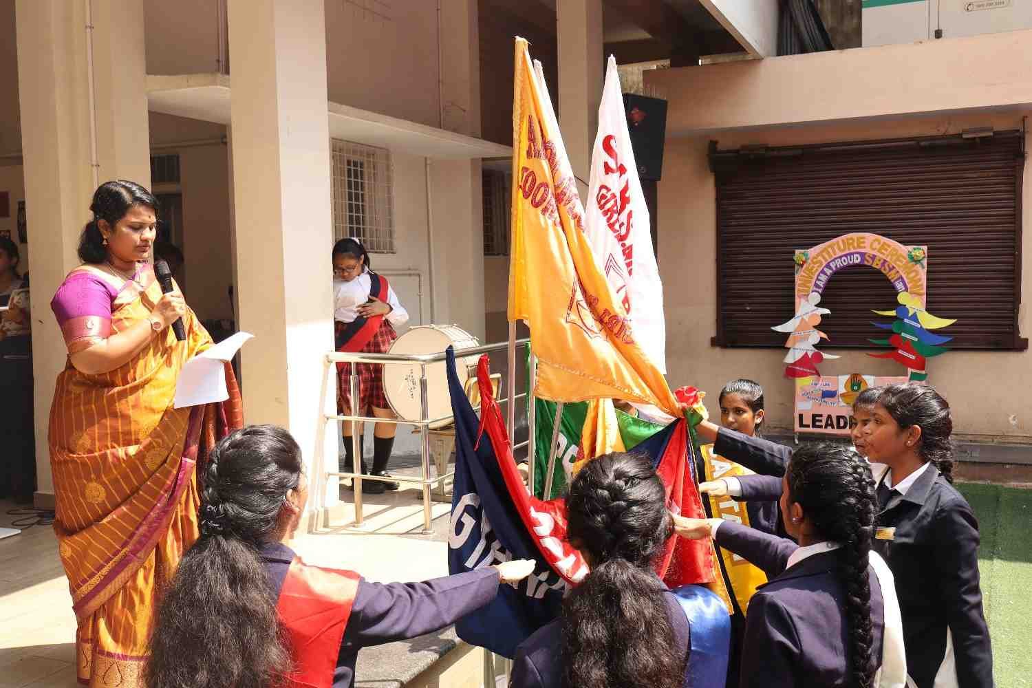 The highlight of the ceremony was the formal investiture of the newly elected Student Council. With poise and confidence, the young leaders marched forward to receive their badges, sashes, and flags—symbols of the trust and responsibility bestowed upon them. The oath-taking ceremony, administered by the Principal, stood as a solemn affirmation of their commitment to uphold the values of discipline, leadership, and service.