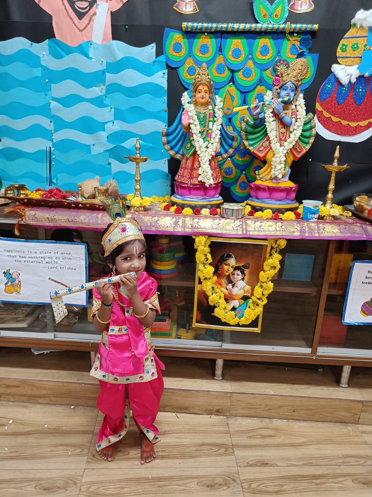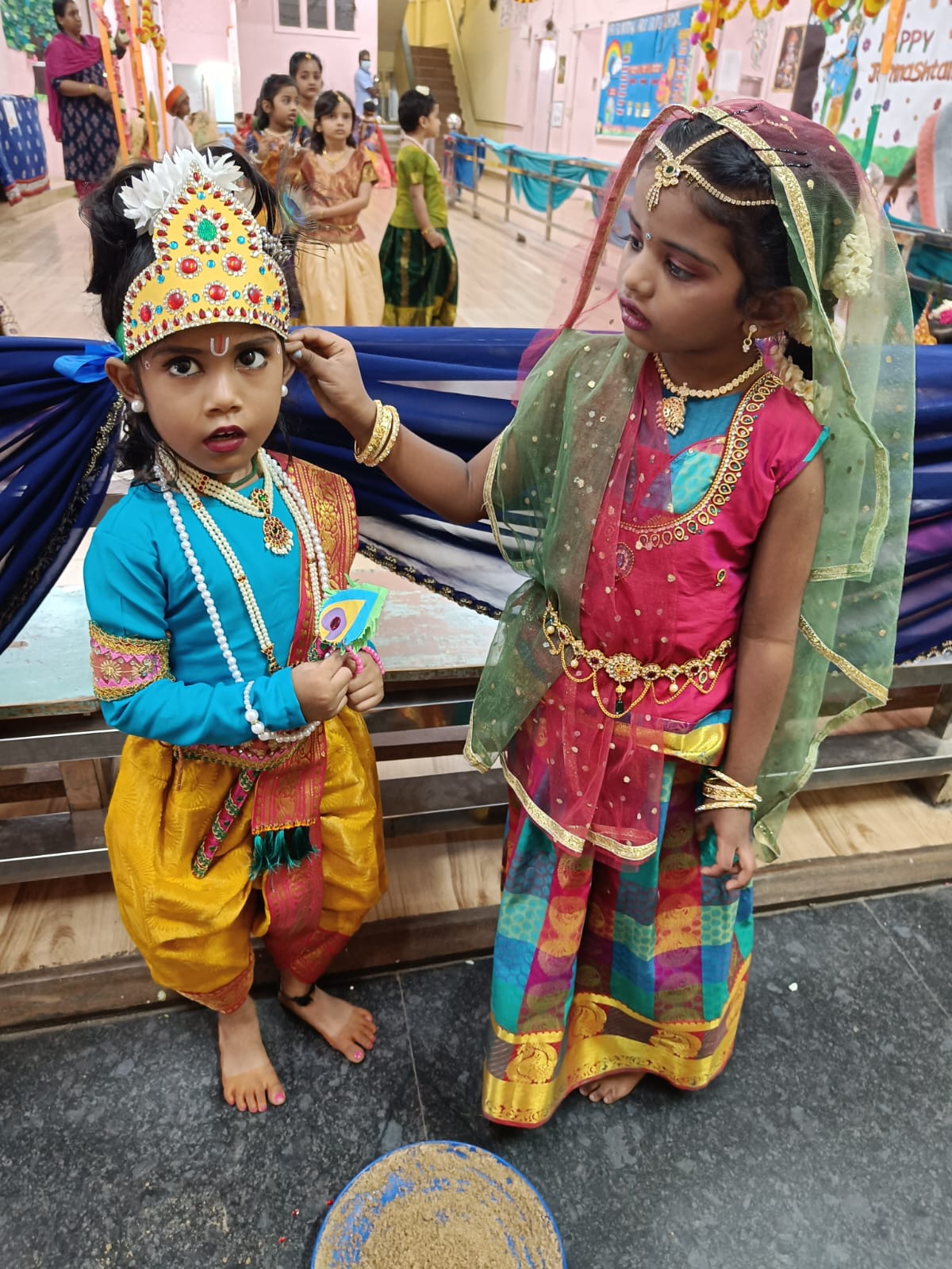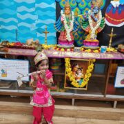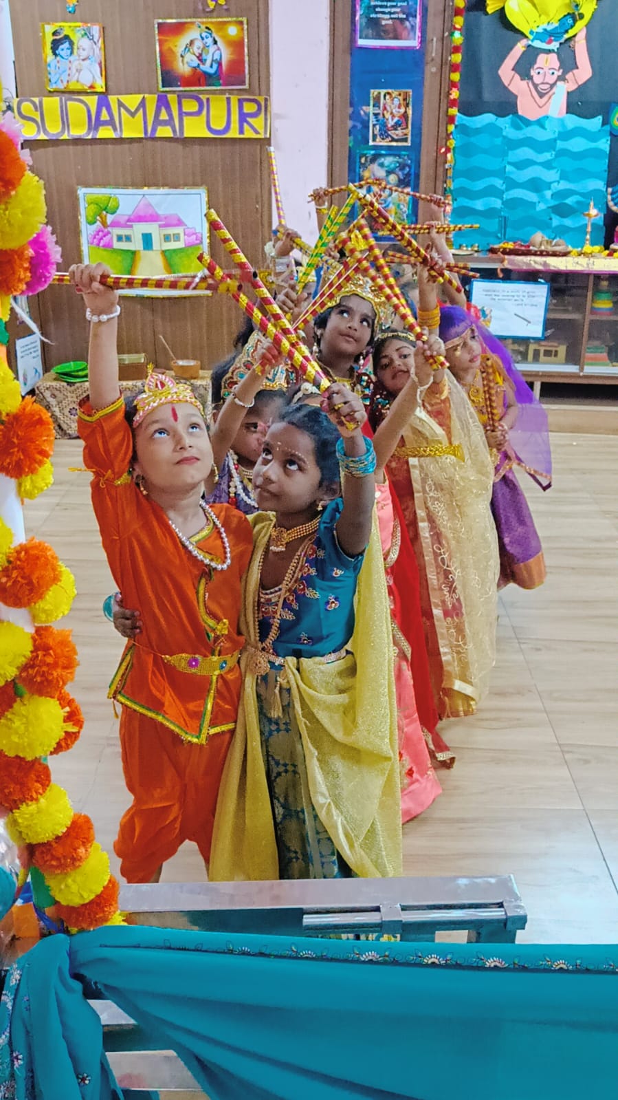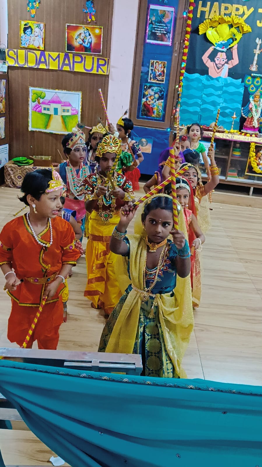 SBSM kindergarten celebrated Janmashtami in a grand way on 4th September 2023 at SSVJ block activity area. Children dressed up as little Krishnas and Radhas were the feast for the eyes. The arena was beautifullly decorated with variety of flowers, charts, lord krishna’s images, quotes etc. Pooja was performed for the idol of krishna by our beloved Principal mam. The skit performed by the children on the bonding between Lord Krishna and his friend Sudhama was a splendid show. The divine dance Rasaleela was mind blowing and was the highlight of the Janmashtami celebrations.
