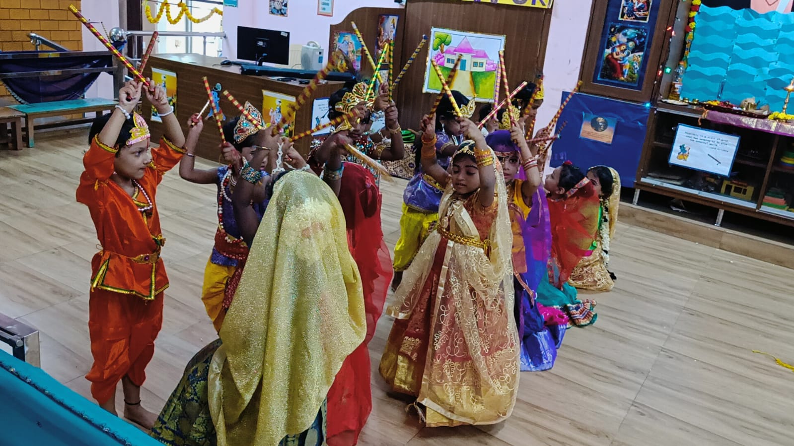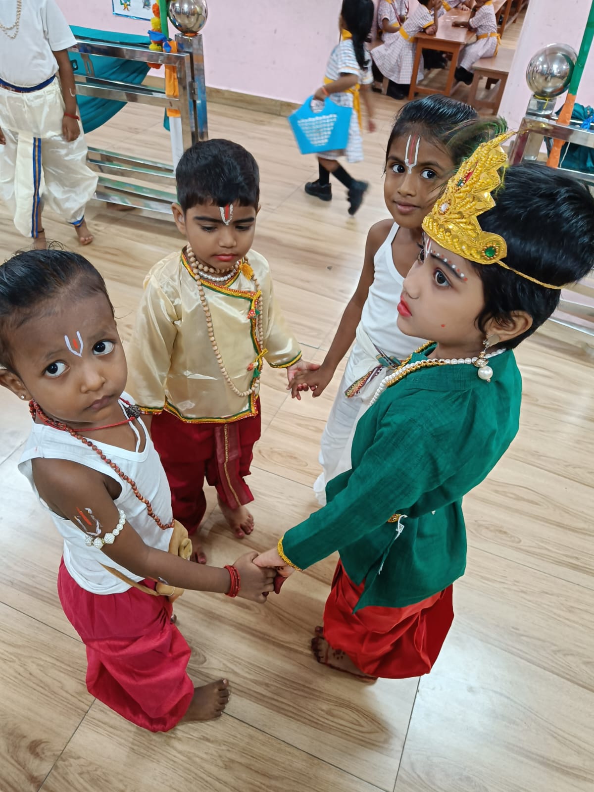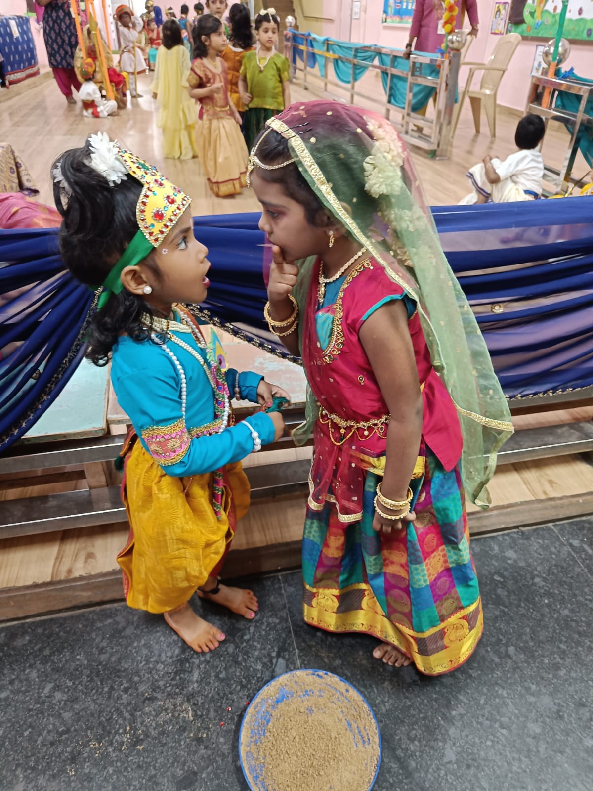 SBSM kindergarten celebrated Janmashtami in a grand way on 4th September 2023 at SSVJ block activity area. Children dressed up as little Krishnas and Radhas were the feast for the eyes. The arena was beautifullly decorated with variety of flowers, charts, lord krishna’s images, quotes etc. Pooja was performed for the idol of krishna by our beloved Principal mam. The skit performed by the children on the bonding between Lord Krishna and his friend Sudhama was a splendid show. The divine dance Rasaleela was mind blowing and was the highlight of the Janmashtami celebrations.