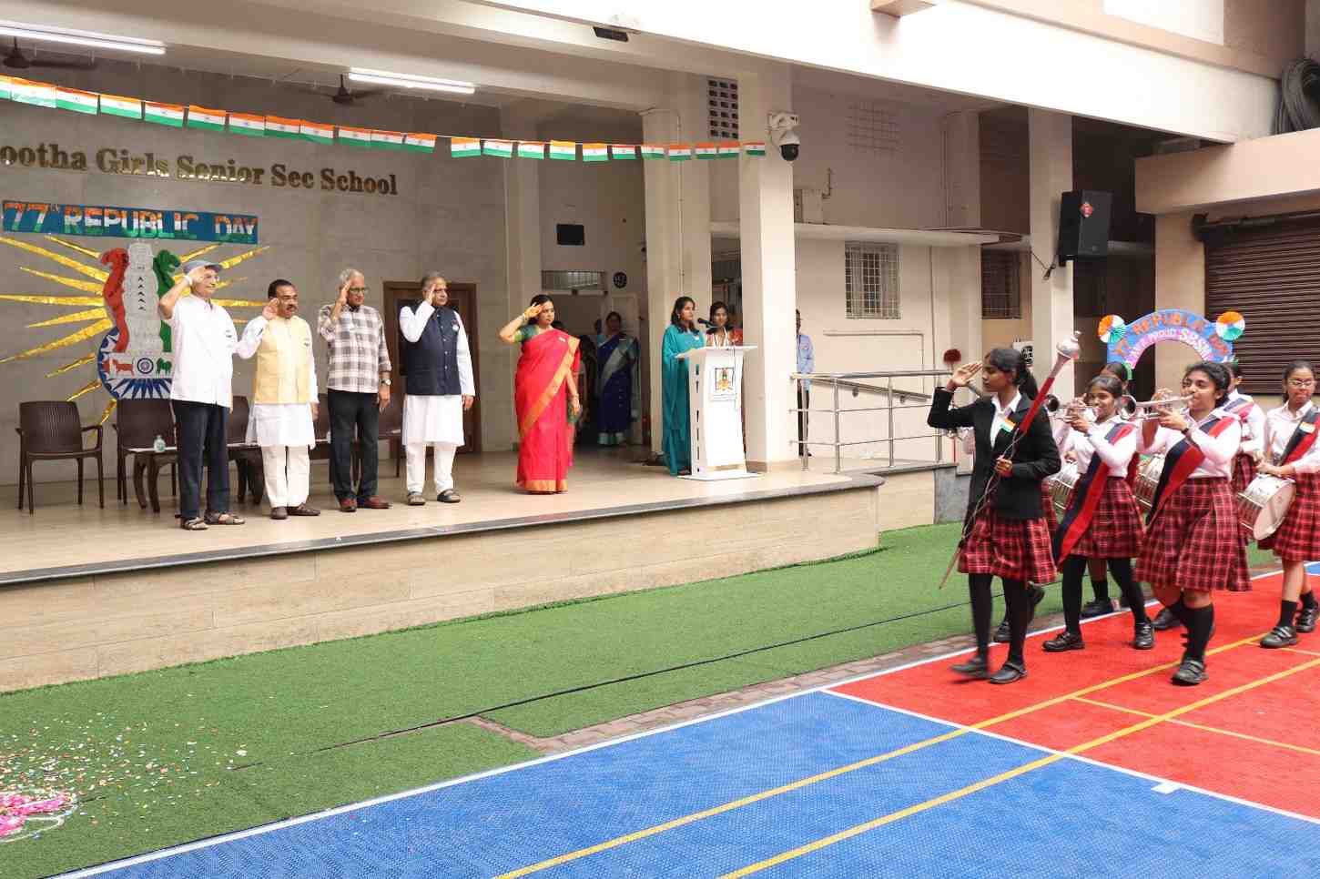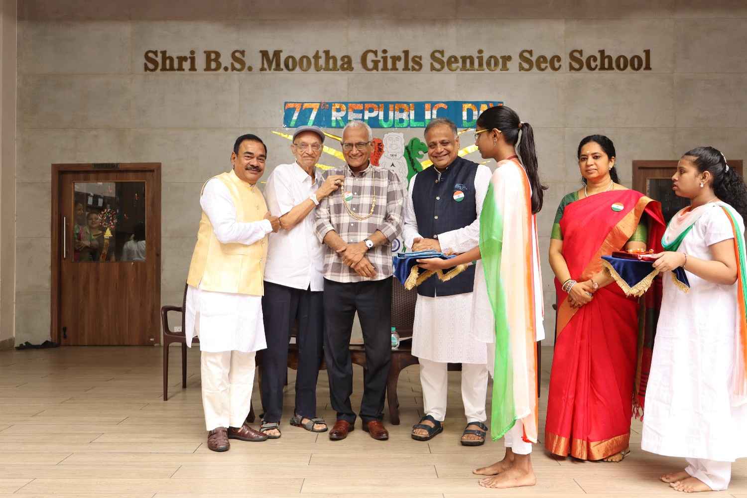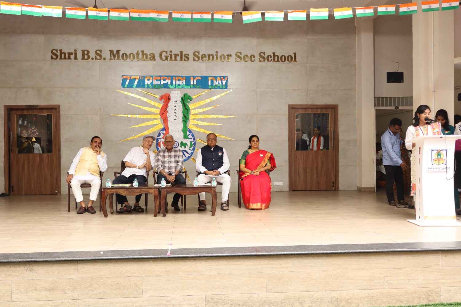 The 77th Republic Day of India was celebrated with great pride and patriotic fervor at SBSM School on 26th January. The school campus resonated with the spirit of nationalism as students, teachers, management members, parents, and distinguished guests gathered to commemorate this important national event. The programme began with a patriotic opening address highlighting the significance of Republic Day, the adoption of the Indian Constitution, and the sacrifices of our freedom fighters. This was followed by a prayer rendered by the school choir, seeking divine blessings and guidance to uphold constitutional values. A warm welcome address was delivered, extending greetings to the respected Chief Guest, management members, Principal, and the gathering. The Chief Guest, Shri Praveen Kumar Tatia, a distinguished entrepreneur, philanthropist, and social leader, was formally introduced. His inspiring journey and remarkable contributions to education, healthcare, and social welfare were highlighted. He was then felicitated by the Management Members and the Principal as a token of respect. The proud moment of the celebration was the unfurling of the National Flag by the Chief Guest. A disciplined and impressive march past by the four houses along with RSP and Guides showcased unity, coordination, and team spirit among the students.